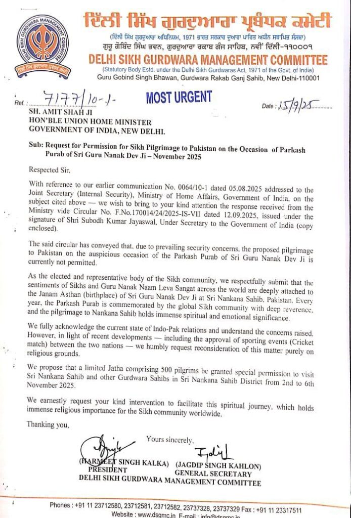 ਨਵੀਂ ਦਿੱਲੀ, 16 ਸਤੰਬਰ 2025: ਦਿੱਲੀ ਸਿੱਖ ਗੁਰਦੁਆਰਾ ਪ੍ਰਬੰਧਕ ਕਮੇਟੀ (ਡੀ.ਐਸ.ਜੀ.ਐਮ.ਸੀ.) ਦੇ ਪ੍ਰਧਾਨ ਸਰਦਾਰ ਹਰਮੀਤ ਸਿੰਘ ਕਾਲਕਾ ਨੇ ਕੇਂਦਰ ਸਰਕਾਰ ਦੇ ਫ਼ੈਸਲੇ ’ਤੇ ਚਿੰਤਾ ਜਤਾਈ ਹੈ, ਜਿਸ ਤਹਿਤ ਗੁਰੂ ਨਾਨਕ ਦੇਵ ਜੀ ਦੇ ਪ੍ਰਕਾਸ਼ ਪੁਰਬ ਸਮਾਗਮਾਂ ਲਈ ਨਨਕਾਣਾ ਸਾਹਿਬ ਜਾਣ ਵਾਲੇ ਸਿੱਖ ਜੱਥੇ ਨੂੰ ਇਜਾਜ਼ਤ ਨਹੀਂ ਦਿੱਤੀ ਗਈ।