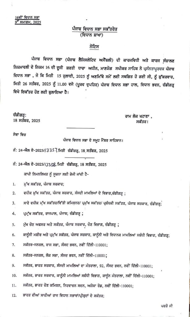 ਪੰਜਾਬ ਵਿਧਾਨ ਸਭਾ ਦਾ ਵਿਸ਼ੇਸ਼ ਸੈਸ਼ਨ ਸੱਦਿਆ ਗਿਆ,
