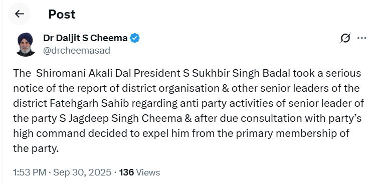 ਦੂਜੇ ਪਾਸੇ ਅਕਾਲੀ ਦਲ ਦੇ ਬੁਲਾਰੇ ਤੇ ਸੀਨੀਅਰ ਲੀਡਰ ਦਲਜੀਤ ਚੀਮਾ ਨੇ ਇੱਕ ਸੋਸ਼ਲ ਮੀਡੀਆ ਦੀ ਪੋਸਟ ਸਾਂਝੀ ਕੀਤੀ ਹੈ, ਜਿਸ ਵਿੱਚ ਜਗਦੀਪ ਚੀਮਾ ਖ਼ਿਲਾਫ਼ ਕਾਰਵਾਈ ਦੀ ਗੱਲ ਕੀਤੀ ਗਈ ਹੈ।