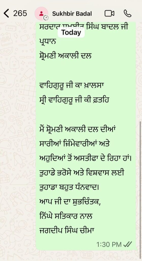 ਜਗਦੀਪ ਸਿੰਘ ਚੀਮਾ ਨੇ ਇੱਕ ਮੈਸੇਜ ਮੀਡੀਆ ਨਾਲ ਸਾਂਝਾ ਕੀਤਾ ਹੈ ਜਿਸ ਵਿੱਚ ਉਹਨਾਂ ਪਾਰਟੀ ਪ੍ਰਧਾਨ ਸੁਖਬੀਰ ਸਿੰਘ ਬਾਦਲ ਨੂੰ ਵਟਸਐਪ ਮੈਸੇਜ ਰਾਹੀਂ ਆਪਣਾ ਅਸਤੀਫ਼ਾ ਭੇਜਣ ਦਾ ਦਾਅਵਾ ਕੀਤਾ ਹੈ।