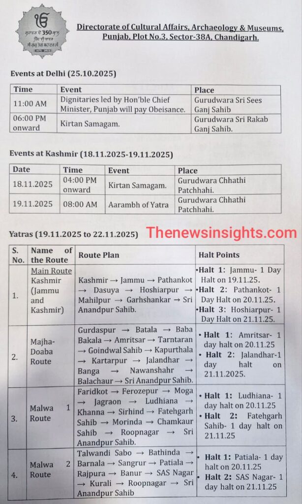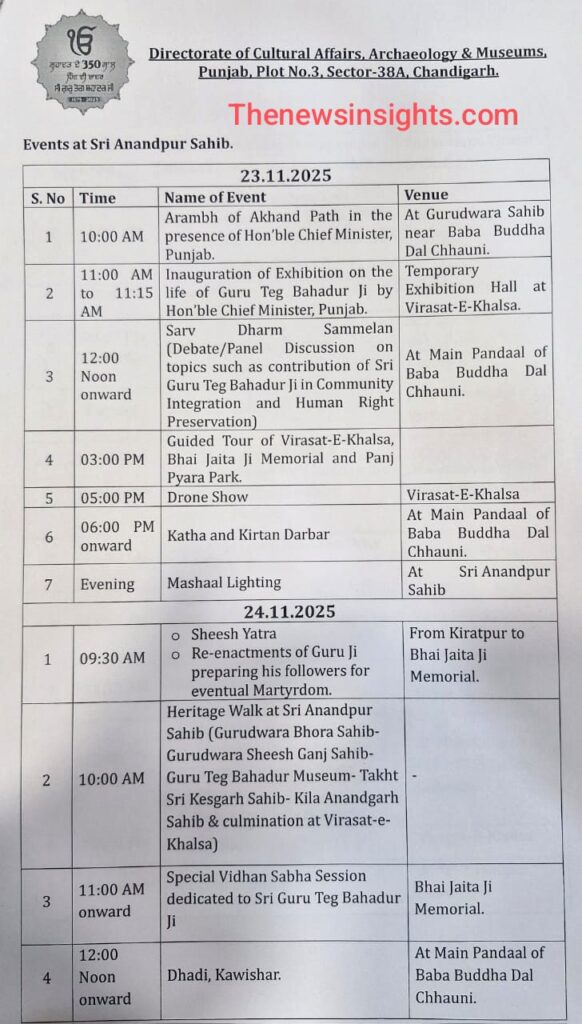 ਸ਼੍ਰੀ ਗੁਰੂ ਤੇਗ਼ ਬਹਾਦਰ ਸਾਹਿਬ ਜੀ ਦੇ 350 ਸਾਲਾ ਸ਼ਹੀਦੀ ਦਿਹਾੜੇ ਮੌਕੇ ਹੋਣ ਵਾਲੇ ਸਮਾਗਮਾਂ ਦੀ ਪੂਰੀ ਸੂਚੀ ਹੇਠਾਂ ਅਨੁਸਾਰ ਹੈ:-