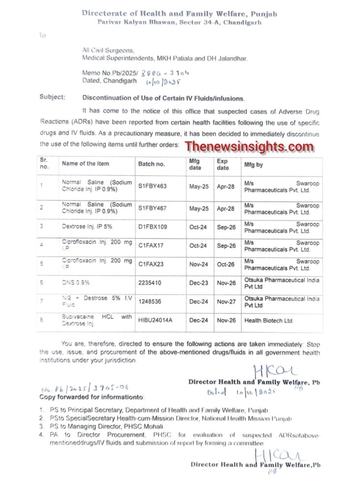 ਪਟਿਆਲਾ ਦੇ ਇੱਕ ਹੋਰ ਡਾਕਟਰ ਨੇ ਹੈਰਾਨੀ ਜਤਾਈ ਕਿ ਇਸ ਤਰ੍ਹਾਂ ਦਾ ਕੋਈ ਹੁਕਮ ਜਾਰੀ ਹੋਇਆ ਹੈ। ਦਿ ਟ੍ਰਿਬਿਊਨ ਦੇ ਕੋਲ ਮੌਜੂਦ 10 ਅਕਤੂਬਰ ਦੀ ਮਿਤੀ ਵਾਲੀ ਚਿੱਠੀ ਵਿੱਚ ਸਾਰੇ ਸਿਵਲ ਸਰਜਨਾਂ ਅਤੇ ਸਰਕਾਰੀ ਹਸਪਤਾਲਾਂ ਦੇ ਮੈਡੀਕਲ ਸੁਪਰਿੰਟੈਂਡੈਂਟਾਂ ਨੂੰ ਲਿਖਿਆ ਗਿਆ ਹੈ ਕਿ ਕੁਝ ਸਿਹਤ ਕੇਂਦਰਾਂ ‘ਚ ਵਿਸ਼ੇਸ਼ ਦਵਾਈਆਂ ਅਤੇ IV ਫਲੂਇਡ ਦੇ ਇਸਤੇਮਾਲ ਤੋਂ ਬਾਅਦ “ਸੰਭਾਵਿਤ ਪ੍ਰਤੀਕੂਲ ਪ੍ਰਭਾਵਾਂ” ਦੇ ਮਾਮਲੇ ਸਾਹਮਣੇ ਆਏ ਹਨ।